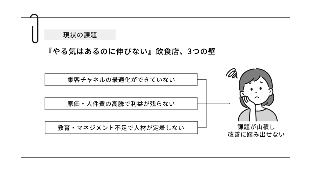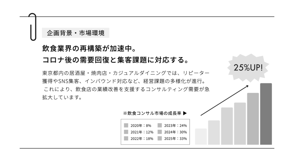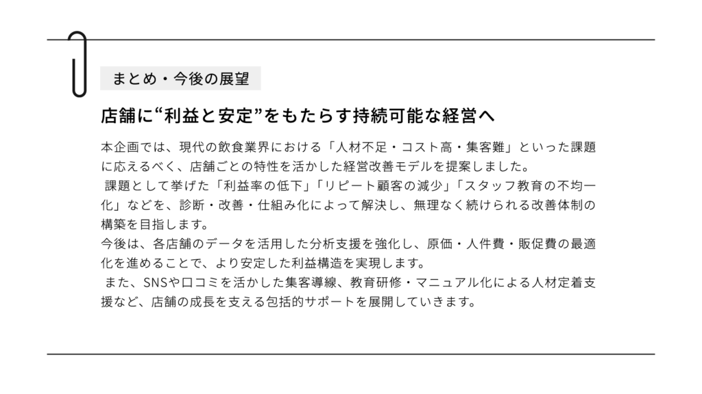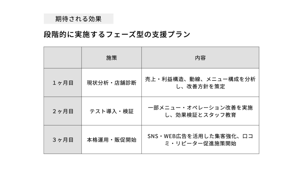 これまでに、個人経営の飲食店から法人運営の複数店舗展開まで、 立ち上げ段階から黒字化・安定運営に至るまでの実践的な支援 を行ってまいりました。机上の理論に偏らず、現場に即した改善提案と実行支援を重視している点が弊社の特徴です。